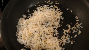 Separately, heat a small, dry frying pan and add the coconut. Toast until lightly golden.