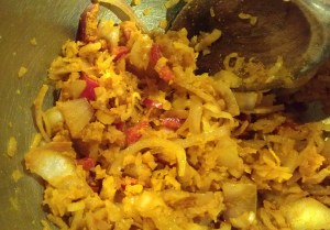 Make the sauce as you cook the rice and before you start cooking the vegetables. When you’re ready, stir-fry the vegetables in a little oil. When the pan becomes dry, add a few spoonfuls of the sauce and stir to coat the vegetables. Keep cooking until the vegetables have softened but still retain some crispness. Add the remaining sauce and mix until everything is coated. Serve immediately over rice.